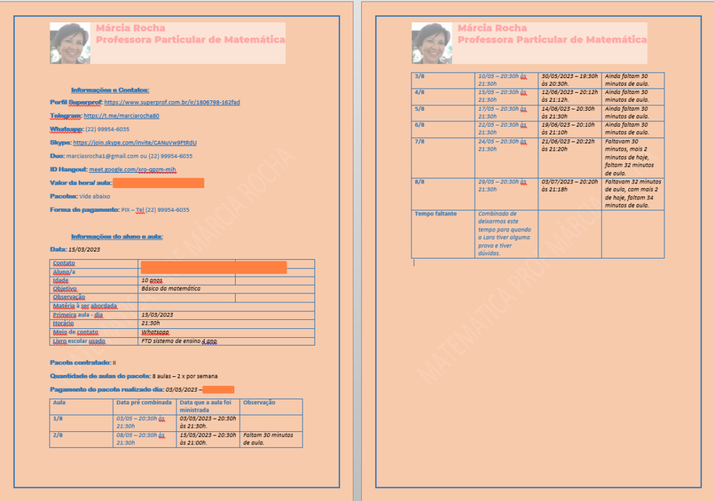 Sendo pacote mensal ou pacote de aulas avulsas, a quantidade de aulas do pacote contratado é anotada em uma planilha e colocado ao lado a data que a aula foi ministrada;