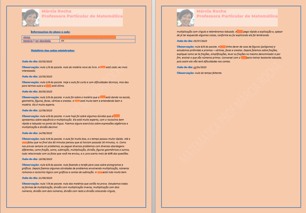 Um relatório das aulas ministradas será apresentado ao responsável do aluno sempre que for solicitado ou quando o professor achar necessário, ou no final de cada ciclo de aulas.